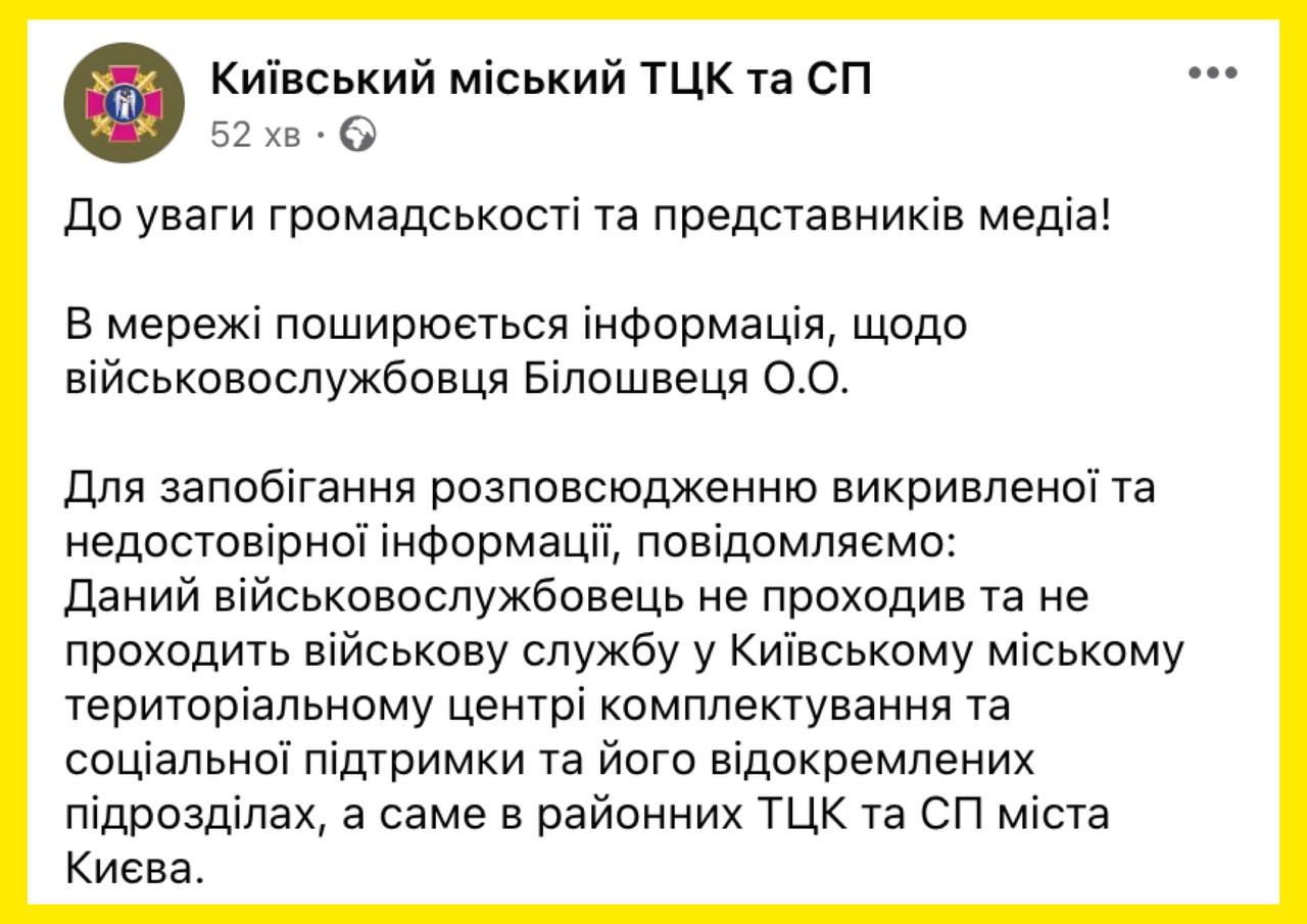 «Biloshvets does not serve in either the Kyiv City or any district TRC», – the official statement reads.