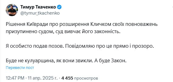 The message also states that Tkachenko independently initiated the lawsuit in court. Currently, the court is analyzing the legality of the Kyiv City Council’s decision.