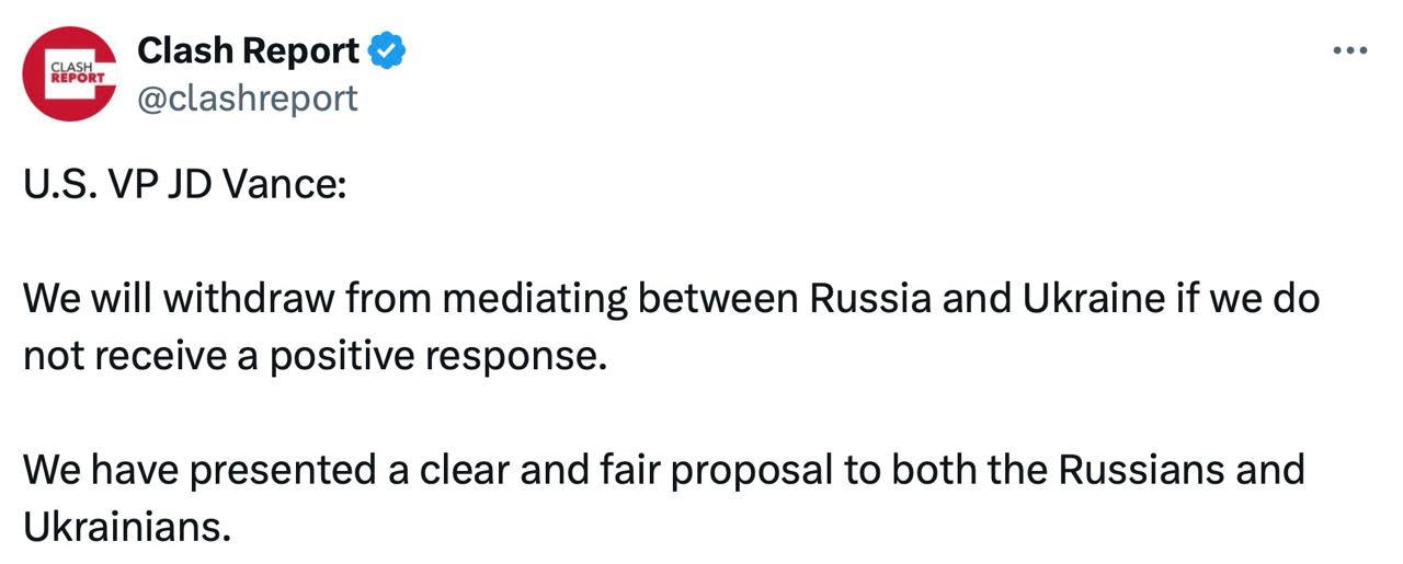 Vice President Vance noted that «the USA will cease mediating between the RF and Ukraine if a positive response is not received».