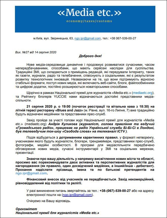 In August 2020, there was a media scandal in Rivne due to Khotenko’s organization, through her controlled NGO "Institute of Tax Reforms," of the so-called "TOP-100 Best Media Figures, Bloggers, and Trendmakers of Rivne Region." However, there was no list of participants for such a ranking within the frame of the National Media Award Media etc., nor did the ranking itself exist.
