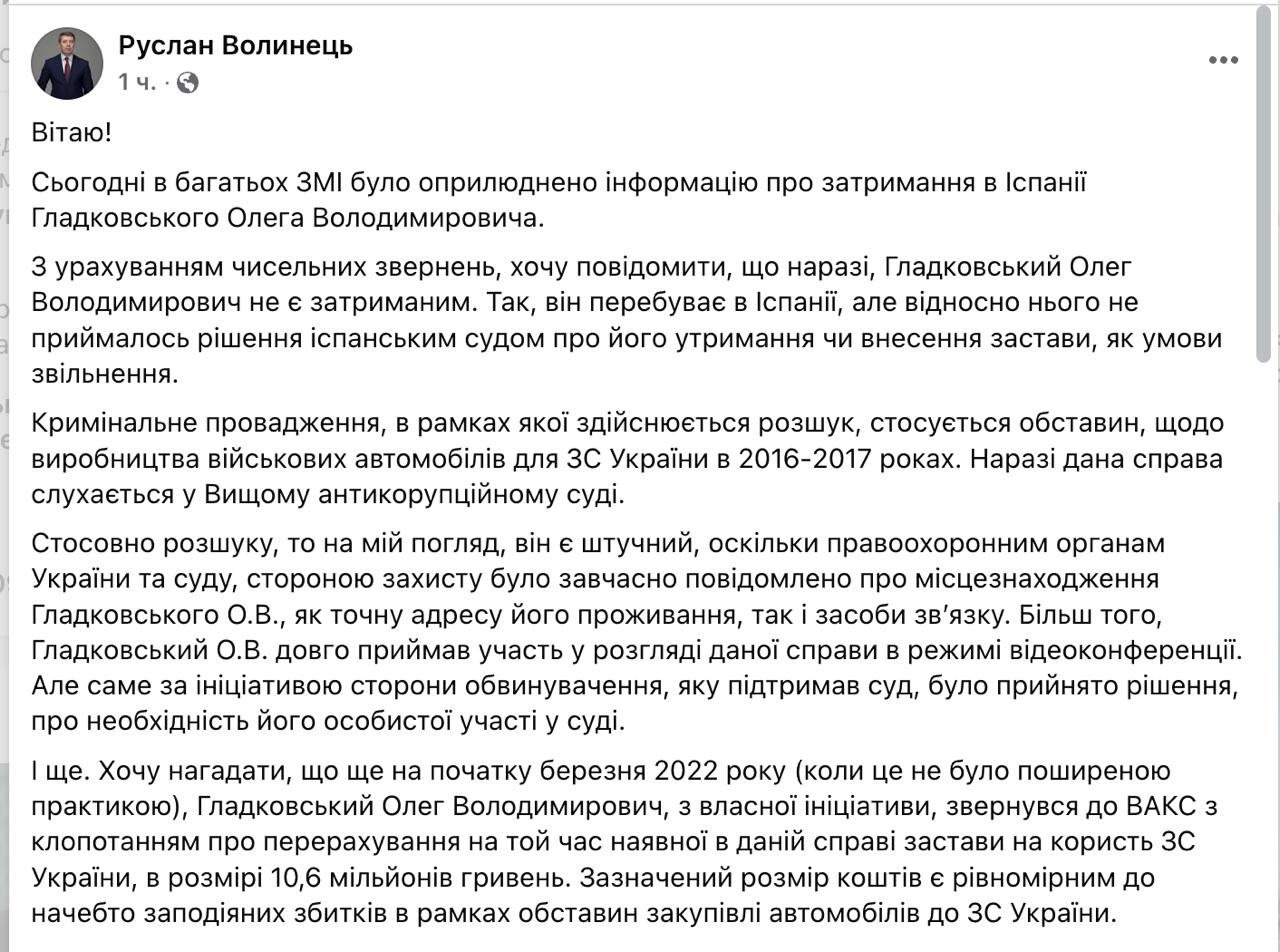 "Oleh Hladkovskyi was not detained. Yes, he is in Spain, but the Spanish court did not decide on his detention or set a bail as a condition for his release," writes Ruslan Volynets.