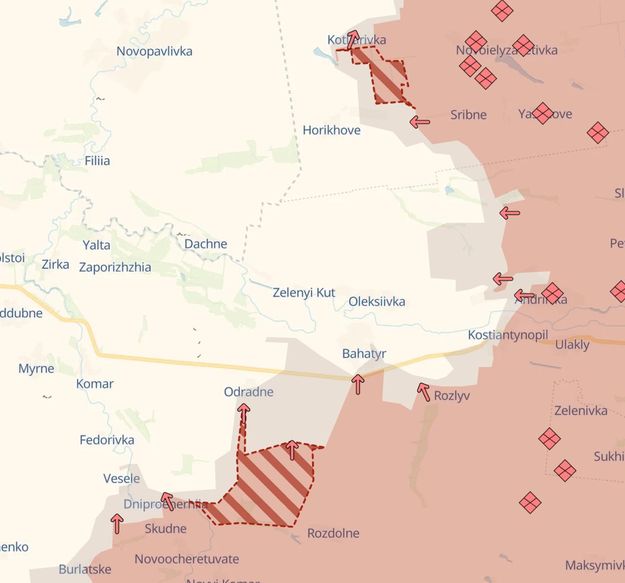 Russian forces have advanced in the area of Vidradne (west of Bahatyr) and near Kotlyarivka (on the border of the Dnipropetrovsk region).