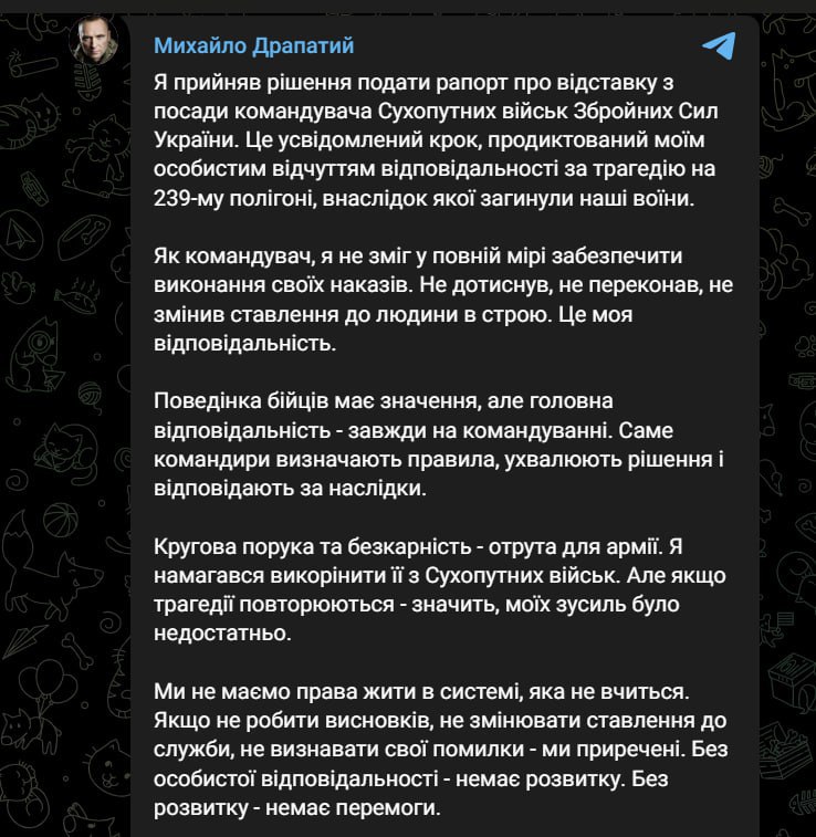 "This is a conscious step, dictated by my personal sense of responsibility for the tragedy at the 239th training ground, which resulted in the death of our soldiers. As a commander, I was unable to fully ensure the execution of my orders," he wrote.