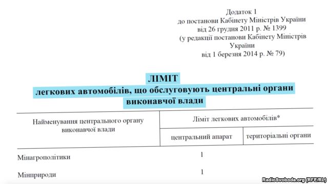In May 2014, the government of Arseniy Yatsenyuk decided to sell off the official car fleets of ministries and issued a decree to make this order official. After the sale, only three vehicles were to remain for use by the central apparatus of the Ministry of Internal Affairs.