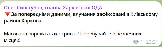 In the Kyiv district of Kharkiv, arrivals have been recorded, reports the head of the RMA Syniehubov.