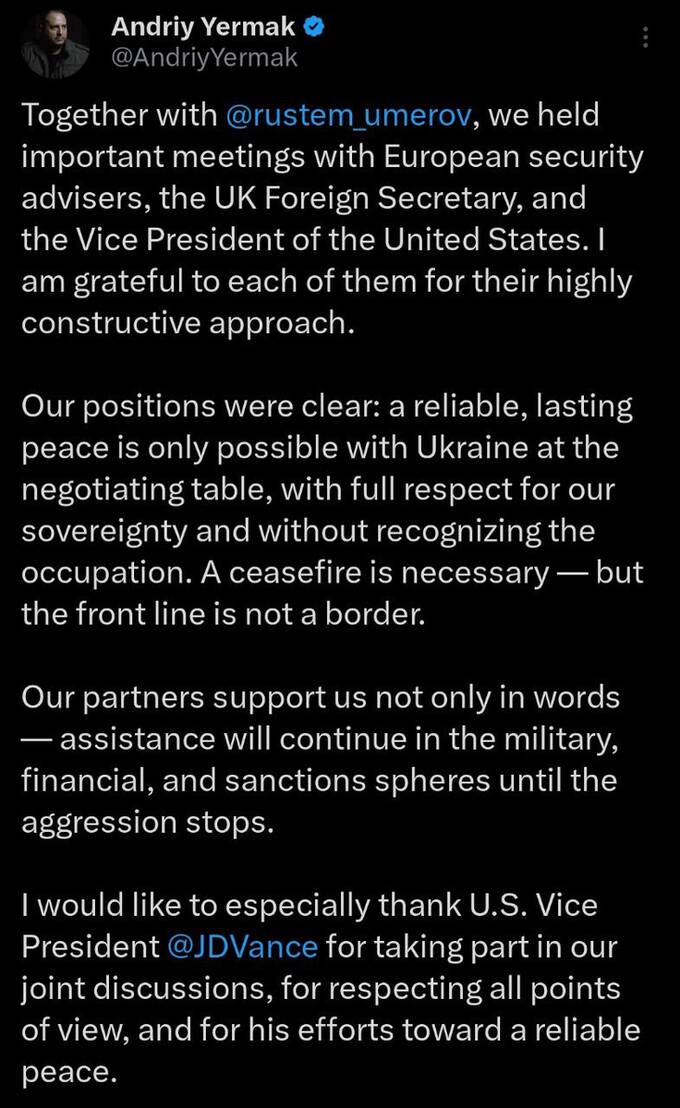 Yermak commented on the meeting with Vance and Lammy