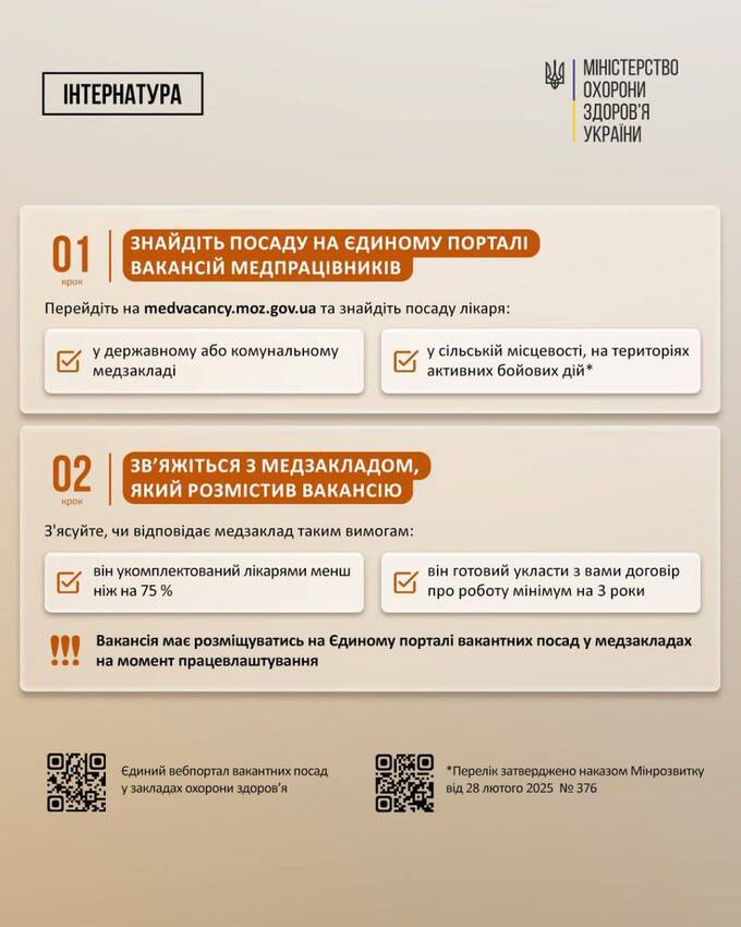 Up to 200,000 UAH in one-time assistance will be provided to doctors who, starting from 2025, complete their internship at one of the 20 state higher education institutions.