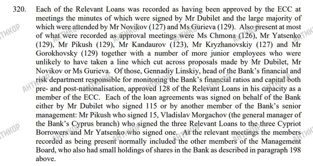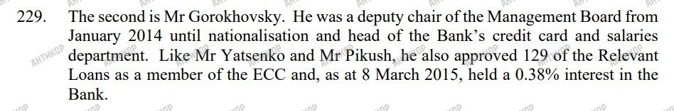 Then comes specificity. The court notes that from January 2014 until nationalization, Gorokhovsky was the deputy chairman of the board and supervised card and salary projects. In this role, he — a member of the credit committee — approved 129 loans that are key in the case. As of March 8, 2015, he owned 0.38% of the bank’s shares. This is dry statistics, but it fits into the picture: decisions on large loans were made by a narrow circle of managers closely tied to the will of the beneficiaries. ("…approved 129 of the Relevant Loans … held a 0.38% interest…" (…approved 129 of the relevant loans … held a 0.38% share…)», page 60, paragraph 229).