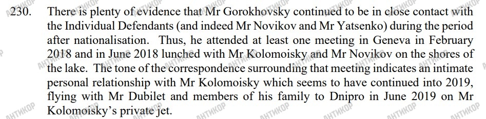 The sharpest — the period after the nationalization of the bank. The court writes that there is "plenty of evidence" of Gorokhovsky’s close contacts with Kolomoiskyi and his entourage even after the bank was transferred to the state: meetings in Geneva (February 2018), a joint lunch (June 2018), a flight to Dnipro on Kolomoiskyi’s private jet (June 2019). This is not a crime in itself, but for the court, these are bricks in the wall of evidence that the former owners’ influence on the "Privat" ecosystem remained. ("There is plenty of evidence that Mr Gorokhovsky continued to be in close contact… (There is plenty of evidence that Mr. Gorokhovsky continued to maintain close contacts…)», page 60, paragraph 230).
