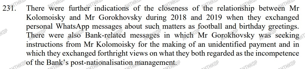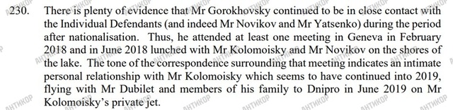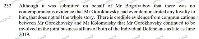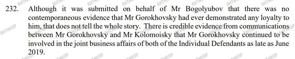 Finally, the court directly states: the communications provide "credible" grounds to believe that Gorokhovsky continued to participate in the joint business affairs of Kolomoiskyi and Bogolyubov at least until June 2019. Again, this is not a sentence, but a very harsh wording for a public document. ("There is credible evidence … that Mr Gorokhovsky continued to be involved in the joint business affairs… (There is credible evidence that Mr. Gorokhovsky continued to be involved in joint business affairs…)», page 60, paragraph 232).