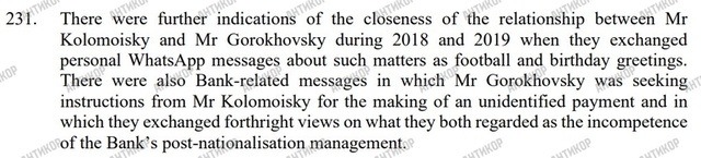 There are also episodes that inevitably raise questions. The court points to WhatsApp correspondence: not only personal messages (football, greetings) but also messages about bank matters where Gorokhovsky "incompetence" of the new management, this looks like an attempt to resolve the bank’s operational issues through the former owner — years after the nationalization. ("…seeking instructions … for the making of an unidentified payment…" (…seeking instructions … for making an unidentified payment…)», page 60, paragraph 231).