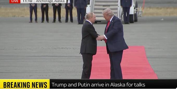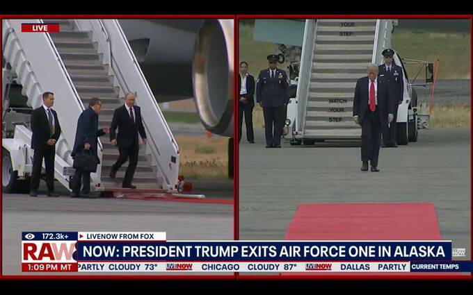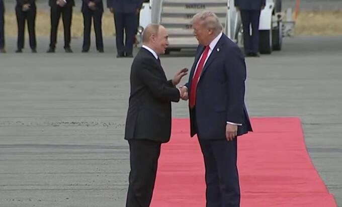 Video recording of the moment when Trump and Putin exit their planes and exchange their first handshake.