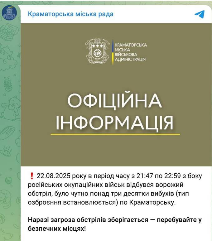 Пізно ввечері 22 серпня росіяни інтенсивно обстріляли Краматорськ. Лише за годину в місті пролунало понад 30 вибухів.