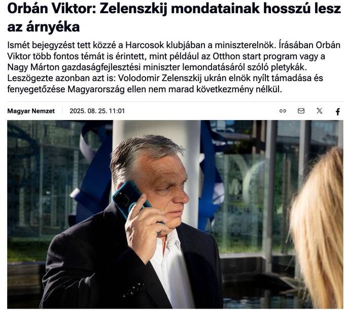 «Зеленський відкрито погрожував Угорщині. Він заявив, що вони завдають ударів по трубопроводу «Дружба», оскільки ми не підтримуємо їхній вступ до Європейського Союзу. Це підтверджує, що угорці зробили правильний вибір», - передає слова Орбана газета Magyar Nemzet.