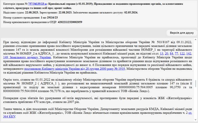 Law enforcement officers note that officials from the Ministry of Defence, the Department of Land Resources of the Kyiv City State Administration (KCSA), the Kyiv City Council, the service cooperative (SC) "Housing Construction Cooperative ’Zhytlobudservis,’" and LLC "Bionic Land" may be involved in these violations.
