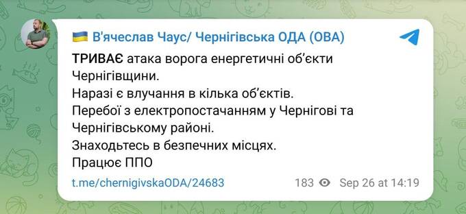 The local authorities report that water supply in Chernihiv has been cut off due to the loss of electricity at water utility facilities.