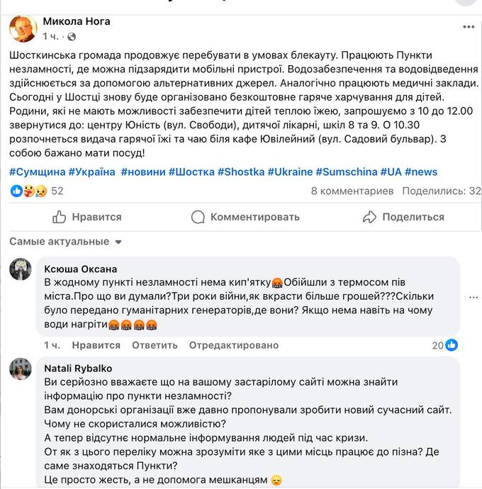 He noted that hot meals have been organized for families with children, and hot food will also be distributed at several addresses (indicated in the screenshot).