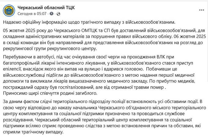 In Cherkasy, a man died while undergoing a medical examination at the TRC.