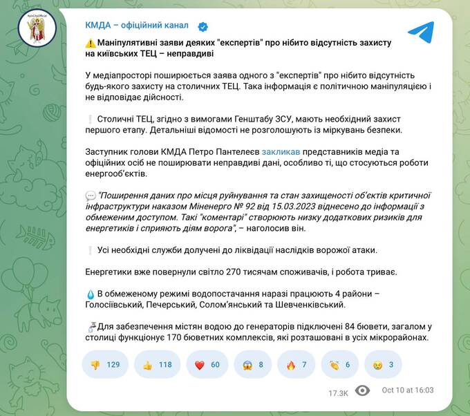 The Kyiv City State Administration emphasized that the statements about the alleged lack of protection at Kyiv’s CHPs are false and a political manipulation. They noted that the capital’s combined heat and power plants have the necessary protection of the first stage, in accordance with the requirements of the General Staff of the Armed Forces of Ukraine, and the dissemination of sensitive information about energy facilities creates risks for energy workers and aids the enemy.