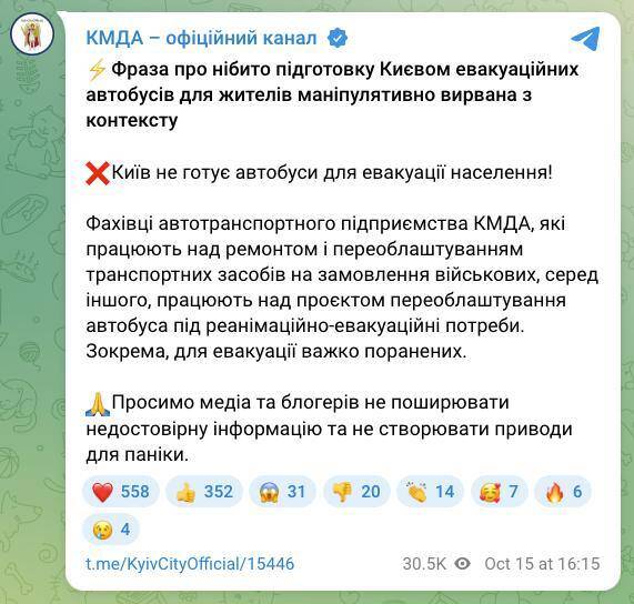 Although evacuation plans and related logistics are regularly updated as part of general civil protection efforts, information about immediate or large-scale preparation of transport for population evacuation is false. Administration representatives urged Kyiv residents to remain calm and trust verified data.