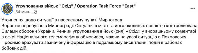 They clarified the situation in Myrnohrad in the Donetsk region. The grouping states that the enemy is not present in Myrnohrad, and the situation in the city and its surroundings is fully under the control of the Ukrainian Defence Forces.