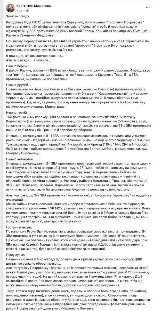 «Judging by the public statement of General Syrskyi, his approach to resolving the «Pokrovsk problem» boils down to eliminating the northeastern «pincers» — in other words, pushing the enemy’s 51st Combined Arms Army beyond the Kazennyi Torets River, at least in the areas of Sukhetske – Razine and Sukhetske – Fedorivka. At the same time, the plan is to hold the northern part of Pokrovsk and, if possible, drive the enemy out of the so-called industrial zone (the area of the 9th Fire and Rescue Unit, Nakhimov Street, etc.)», — notes Mashovets.