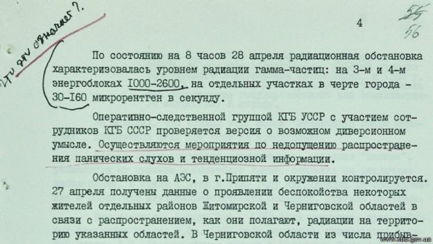 Виходячи із доповідних КДБ, найважливіше для влади на той момент – не зберегти життя і здоров’я громадян, а з’ясувати, чи не був вибух на ЧАЕС диверсією, а також запобігти поширенню чуток: "Особливу увагу приділено контролю за оперативною обстановкою в Київській, Чернігівській, Житомирській та інших областях у зв’язку із надзвичайною подією, що мала місце на 26 квітня 1986 року на Чорнобильській АЕС. Здійснюються оперативні заходи із з’ясування можливого ворожого умислу і причин цієї події, недопущення розповсюдження напічних чуток і тенденційної інформації".