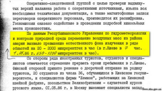 "За даними республіканського Управління з гідрометеорологічного контролю довкілля, переміщення повітряних мас із району аварії викликало перевищення природного фону опромінення у низці областей на 20-2000 мікрорентгенів на годину (в м. Києві в 7-00 1.05.1986 550-1200 мікрорентген на годину)", - йдеться у довідці 6-го управління КДБ УРСР від 1 травня 1986 року.