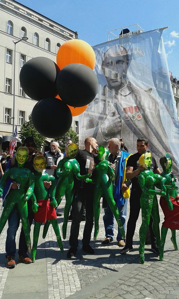 Снимки продемонстрировали сразу несколько блогеров, а также украинские активисты в чешском городе. На них видно группу активистов, которые держат в руках надувных зеленых кукол, к головам которых прикреплены фото российских политиков и активистов. Кроме того, некоторые участники акции держат в руках флаги Украины, США и НАТО. Также невозможно не заметить поражающий своей величиной баннер, на котором изображен Путин с с усиками Гитлера и в его форме.