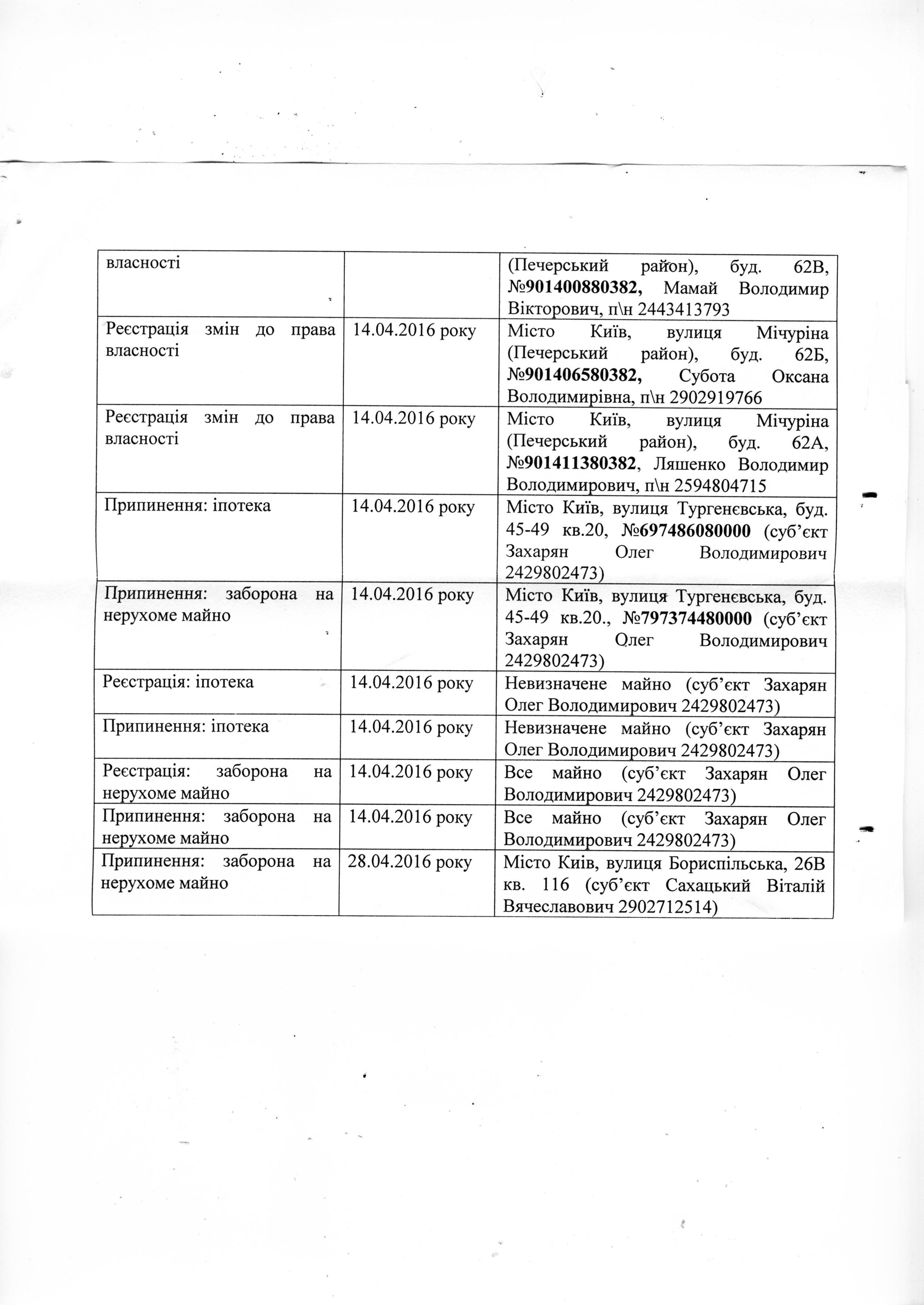 К письму прилагается перечень действий, ради которых неизвестные взломали доступ к реестру. Исходя из этих данных, троих человек (Мамай Владимир Викторович, Суббота, Оксана Владимировна, Ляшенко Владимир Владимирович) выписали из дома в Печерском районе Киева по адресу Мичурина, 62. После этого всех троих прописали по адресу Мичурина, 62 А, Б и В. Законным методом эта операция не могла быть осуществлена, поскольку дом был в ипотеке, что предусматривает запрет на продажу.