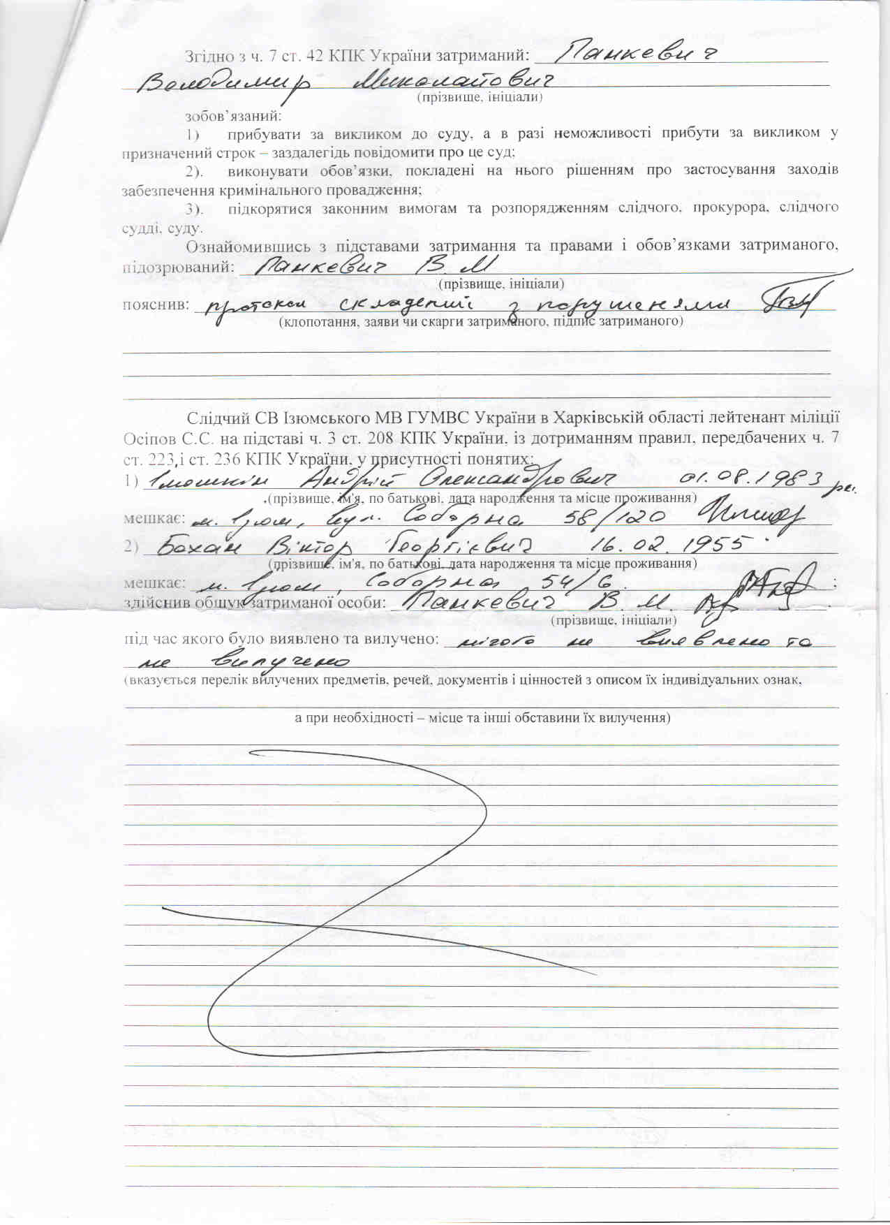 - слідчі, щоб довести справу до суду, оголосили Володимира Панкевича в розшук, при тому, що він постійно був на зв’язку та писав рекомендовані листи слідчому про те, що не переховується. Разом з тим, за тиждень до прийняття такої незаконної постанови Володимир був присутній в Ізюмському суді разом із слідчим і прокурором по розгляду одного з питань даного кримінального провадження. Проте, жодних викликів чи претензій до Володимира в «служителів закону» на той момент не було. І от ще один парадокс, жодних дій після прийняття такої постанови слідчий не вчиняв по провадженню, а тому невідомо для чого так свідомо затягувались строки досудового розслідування;
