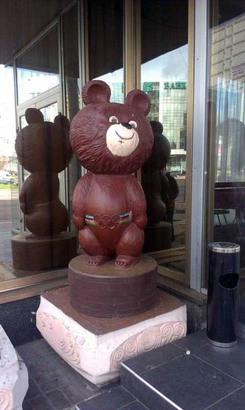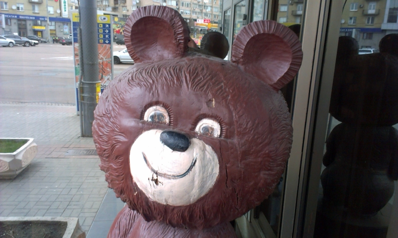 Мишка с поясом с олимпийскими кольцами являлся символом Олимпиады-80, которая прошла в Москве. Киевский Мишка был сделан из дерева, и он является одногодкой гостиницы "Лыбидь", которая также была построена в 1980.