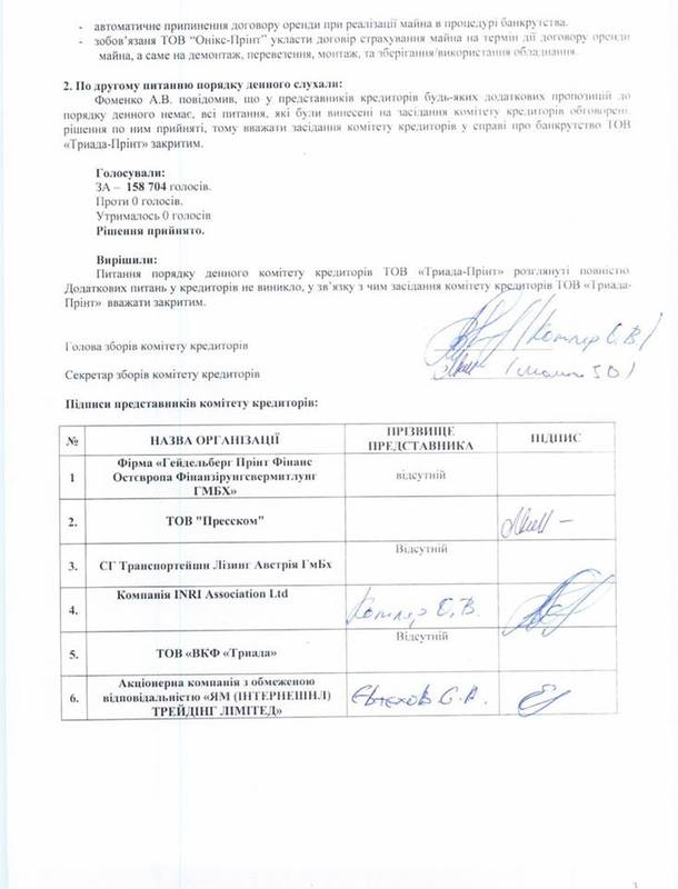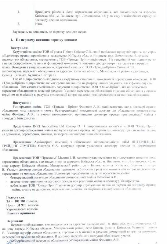 10 июня 2013 года хозяйственный суд г. Киева утвердил мировое соглашение в деле о банкротстве «Триады», согласно которого часть долга перед YAM должна была быть погашена должником согласно графика, а на часть долга должник обязан был выдать простой вексель. Кроме этого, пункт 6.12. мирового соглашения предусматривал, что в случае нарушение должником условий мирового соглашения в части погашения требований YAM, он безусловно обязуется передать в его собственность печатную машину.