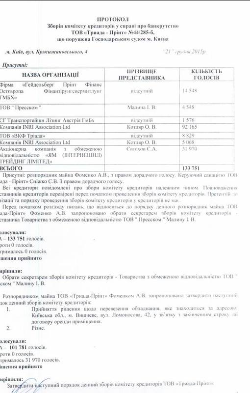 YAM International обращает внимание на ситуацию в компании «Триада-принт». Последние несколько месяцев операторы рынка могли наблюдать судебные разбирательства по поводу имущества «Триады-принт». Основной спор идет вокруг типографского оборудования предприятия. В частности, главной «рабочей лошадки» компании машины Super Perfector корпорации Komori, стоимостью 12,5 млн. грн.