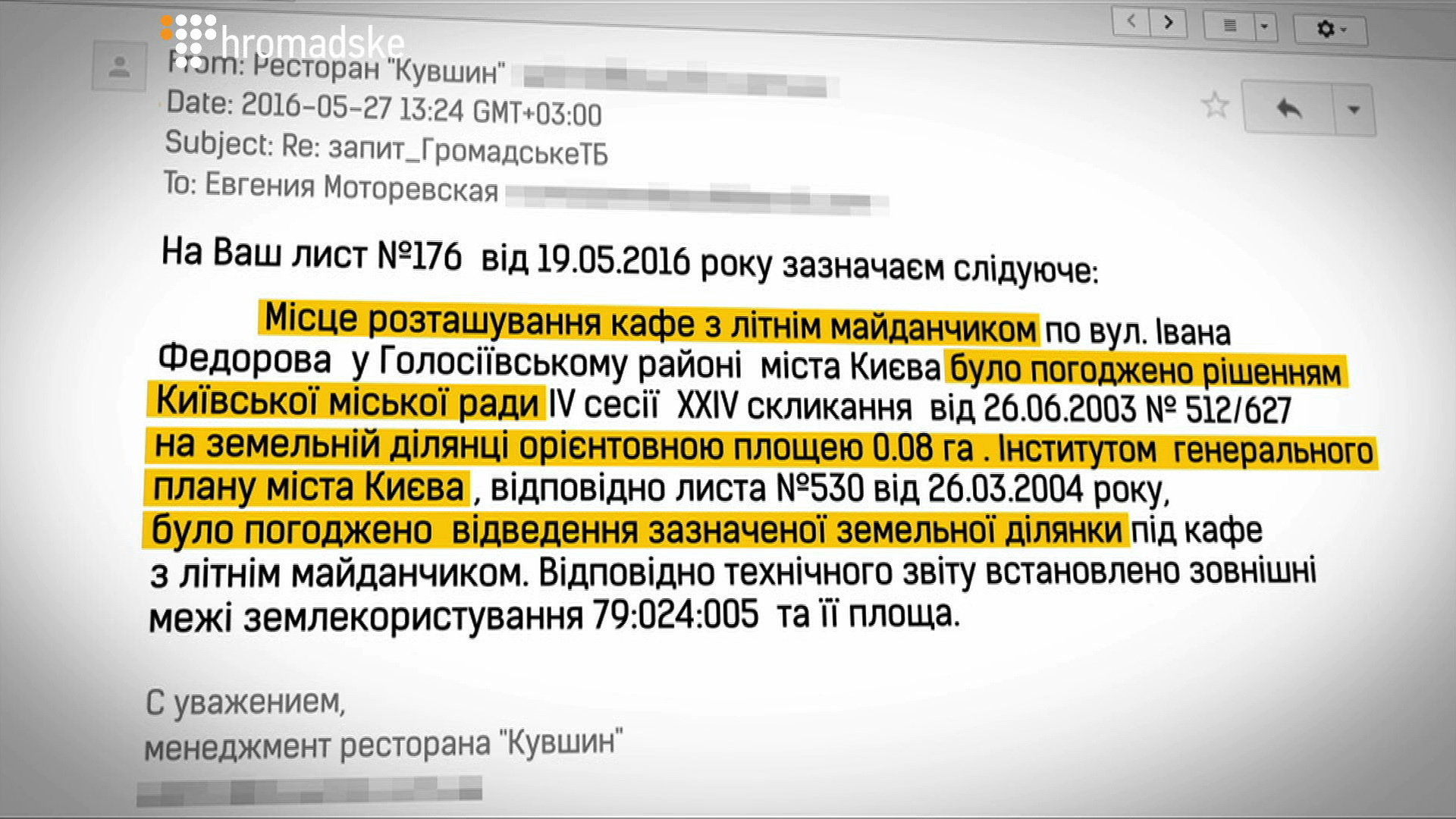 «Місце розташування кафе з літнім майданчиком було погоджено рішенням Київської міської ради на земельній ділянці орієнтовною площею 0.08 га. Інститутом генерального плану міста Києва було погоджено відведення зазначеної земельної ділянки. Відповідно технічного звіту встановлено зовнішні межі землекористування та її площа».