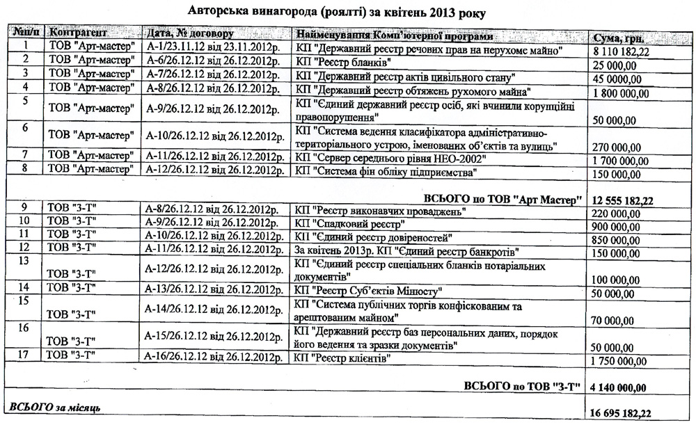 Поводом к нашим расследованиям были материалы проверки КРУ (ныне — Государственная финансовая инспекция Украины), проведенной относительно деятельности государственных реестров в 2009 г. по приказу тогдашнего премьер-министра Ю.Тимошенко, которая разоблачила вопиющие коррупционные схемы в работе министерства, являющегося олицетворением украинской Фемиды. Тимошенко не успела принять решения относительно этой проблемы. ZN.UA впервые сделало достоянием гласности результаты проверки госпредприятия "Информационный центр" Минюста. Сделка заключалась в том, что из 18 государственных реестров, администрируемых "Информцентром", в собственности государства находились только три, а остальные принадлежали "Арт-мастеру" и "3-Т", с которыми "Информцентр" заключил соглашения на пользование программной продукцией без проведения тендеров.