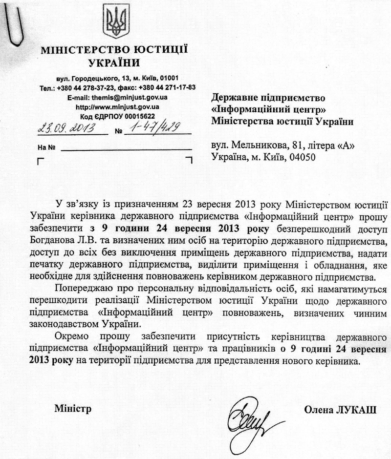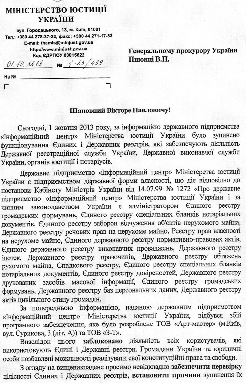 1 октября 2013 г. в связи с техническими проблемами, возникшими во время ведения реестров информационной сети Министерства юстиции Украины, осуществляемого государственным предприятием "Информационный центр" Министерства юстиции Украины, был прекращен доступ к реестрам, обеспечивающим деятельность Государственной регистрационной службы Украины, Государственной исполнительной службы Украины, органов юстиции и нотариусов.