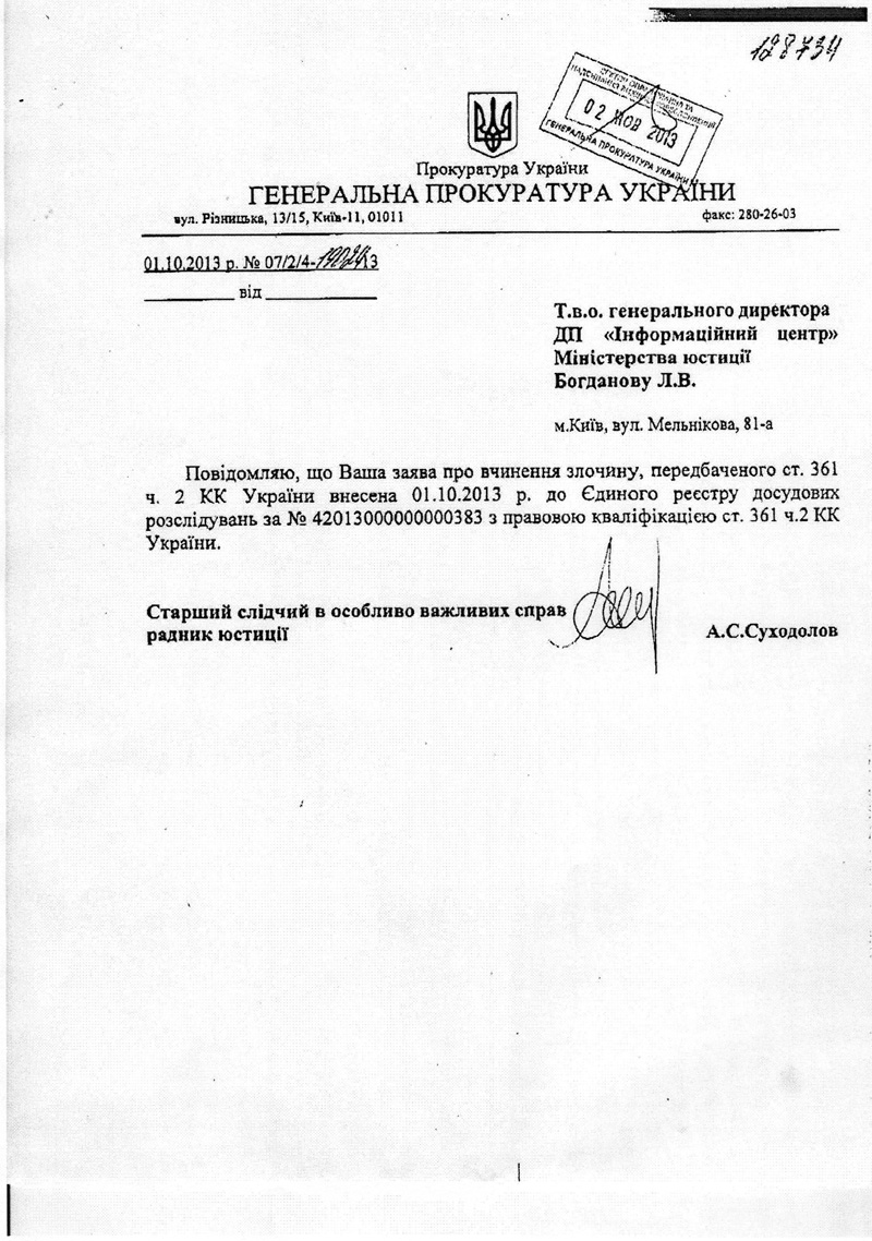 А теперь относительно событий 1 октября 2013 г., когда Министерство юстиции Украины на своем интернет-сайте сообщило о блокировании реестров, обеспечивающих деятельность Государственной регистрационной службы Украины, Государственной исполнительной службы Украины, органов юстиции и нотариусов. Итак, Генеральная прокуратура Украины сообщила о выявлении факта вмешательства в информационные сети Министерства юстиции и открытии по этому поводу уголовного дела.
