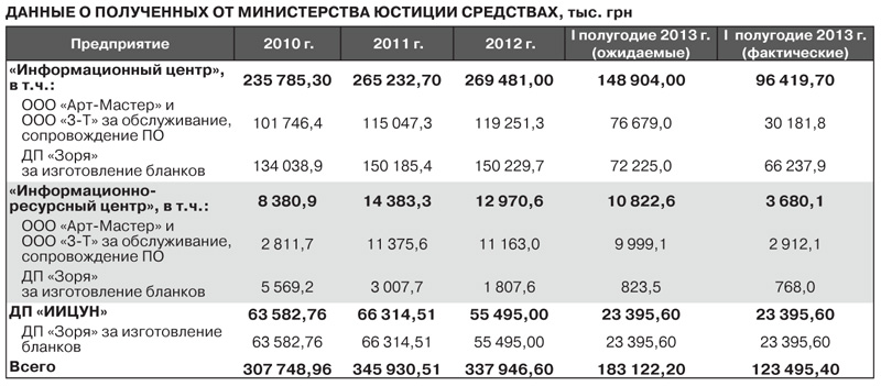 Итак, общая сумма выплат госпредприятию "Информационный центр" от Минюста за 2010–2013 гг. за то, что украинцы пользовались принадлежащими государству реестрами, составила 1 миллиард 115 миллионов 120 тысяч гривен!