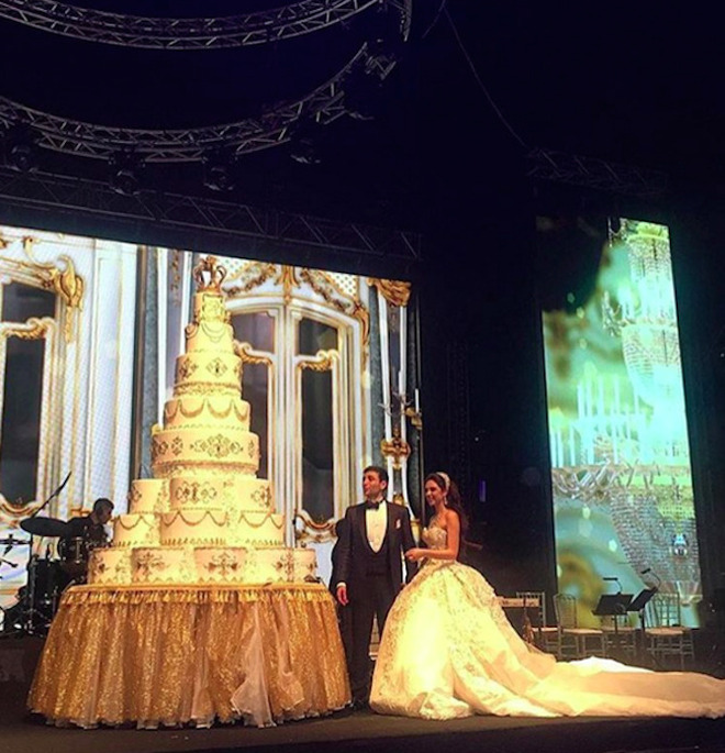А весільний торт, прикрашений золотою короною, шокував гостей своїми розмірами – на його фоні люди виглядали дуже маленькими.
