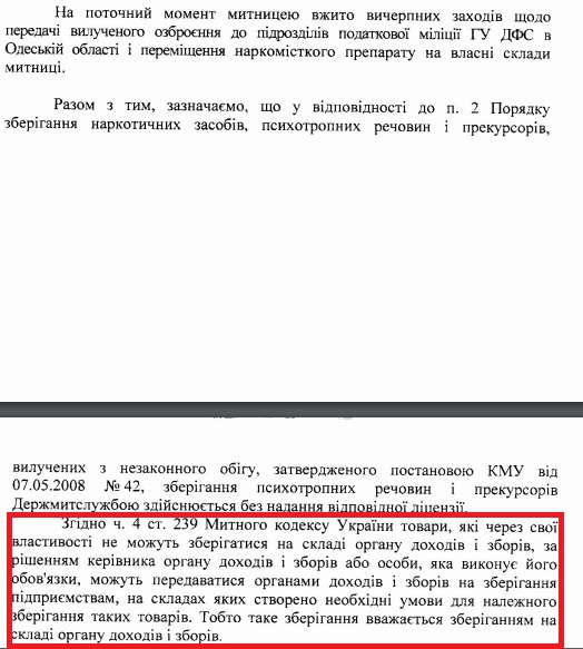 Далее. О том, что изъятые препарат «Terakof», оружие и боеприпасы хранятся не по правилам, в Одесской таможне вспомнили только после внепланового аудита. И зашевелились, предприняв, как сказано, меры по передаче оружия подразделениям налоговой милиции Одесской области, а наркотика – на собственные склады.