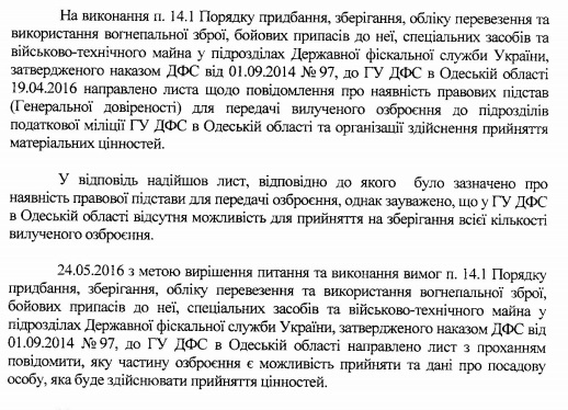 После разноса проверочной комиссии выяснилось также, что в Одесской таможне не хватает места для реквизированного оружия. Только в конце мая таможня обратилась в ГУ ГФС Одесской области с просьбой разъяснить, какое количество оружия подразделения фискальной милиции могут принять на баланс и какое лицо будет ответственно за прием военно-технического имущества.