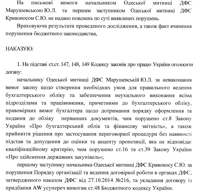 Тем временем, подробности инцидента с ПО Марушевская и Саакашвили не открывали. А вот ГФС нам предоставили подробную информацию по этому скандалу. В частности, по итогам внепланового аудита Насиров издал приказ от 05.04.2016 года о вынесении Марушевской выговора №1 на основании статей 147, 148, 149 Трудового кодекса.