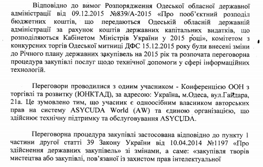 Участник тендера был всего один – Конференция ООН по торгам и развитию (ЮНКТАД), который и владеет авторскими правами на ASYCUDA. Одесситы говорят о законности переговоров, ссылаясь на пп 1-2 ст. 39 закона “Об осуществлении государственных закупок”, где сказано, что если поставщик услуг не имеет конкурентов на рынке, и альтернативы ему нет, то с таким поставщиком услуг можно заключать договор.