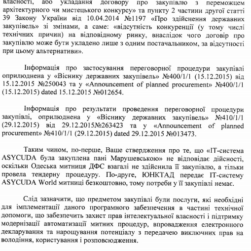 Также уточняется, что Одесская таможня ГФС не осуществляла закупку ASYCUDA, которую Одессе даром предоставляет ЮНКТАД, а лишь провела тендерную процедуру на закупку технических услуг по установке этого ПО, которые обеспечат защиту прав интеллектуальной собственности, внедрение электронных деклараций и пр.