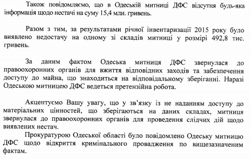 Одесской таможне неизвестно об общих потерях в размере 15,4 млн гривен в результате недостачи, но информация о нехватке 492, 8 тыс. гривен по итогам инвентаризации – верная. Поэтому таможня обратилась в органы для доступа к имуществу, находящемуся на ответственном сохранении на складах.
