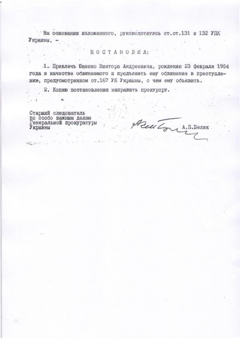 Обнародовано постановление о привлечении к уголовной ответственности в качестве обвиняемого экс-президента Виктора Ющенко по статье халатность, уголовное дело было возбуждено Генпрокуратурой Украины в 1994 году.