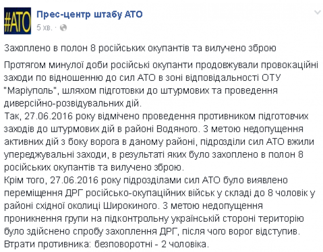 «В результате успешных действий сил АТО по обезвреживанию диверсионно-разведывательной группы, в районе н.п.Водяное захвачены в плен 8 военнослужащих 5 мотострелковой роты 2 мотострелкового батальона 9 отдельного штурмового мотострелкового полка морской пехоты (Новоазовск) 1 АК ВС РФ: ПЕСТРЯЕВ Сергей Николаевич ( 09.05.1967 г.р.), ТОЛСТОЛУК Алексей Павлович (23.03.1980 г.р.), ЗЮМИН Юрий Анатольевич (13.02.1981 г.р.), ШЕВЕЛЕВ Виталий Геннадьевич (06.01.1995 г.р.), ГОРБУШКО Антон Николаевич (07.09.1978 г.р.), ВАНТУЛА Валентин Викторович (04.11.1975 г.р.), ТЕРНОВЫЙ Роман Николаевич (08.01.1980 г.р.), АНРИЛЕВСЬКИЙ Руслан Олегович (23.11.1988 г.р.)», - сообщают разведчики.