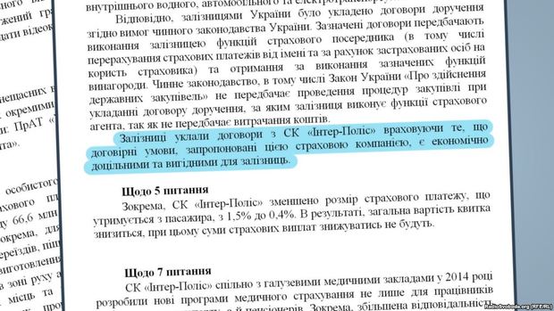 Із залізниці нам дали письмову відповідь. У листі підтвердили, що обрали фірму "Інтер-поліс" без конкурсу на власний розсуд. "Залізниці уклали договори з СК "Інтер-Поліс" враховуючи те, що договірні умови, запропоновані цією страховою компанією, є економічно доцільними та вигідними для залізниць", – йдеться у відповіді прес-центру Укрзалізниці.