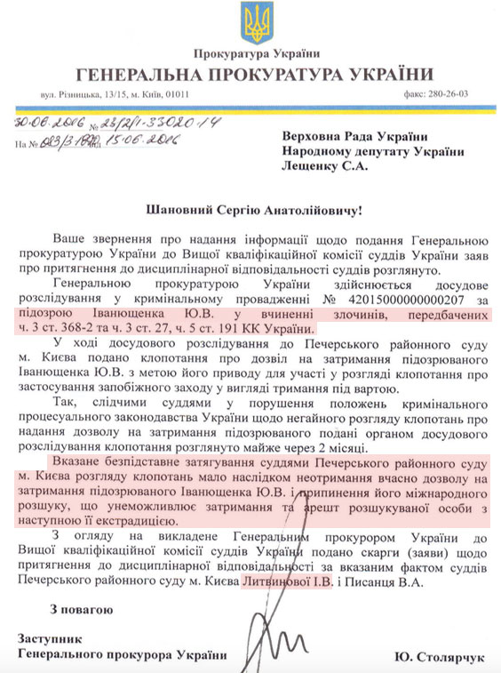 І четвертий збіг – саме до судді Литвинової потрапило клопотання Генпрокуратури щодо арешту Іванющенко, яке було необхідно для його оголошення в міжнародний розшик. І так сталося, що суддя Литвинова... вчасно не розглянула звернення, а це "мало наслідком припинення міжнародного розшуку".